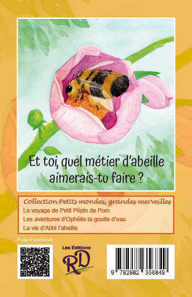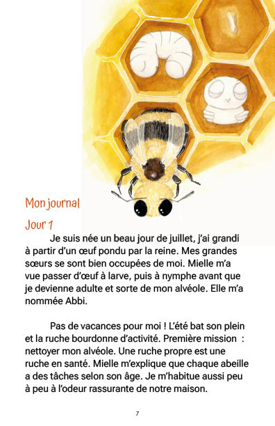 La vie d’Abbi l’abeille raconte, sous forme de journal, le quotidien d’une petite abeille ouvrière, de sa naissance jusqu’à sa dernière mission. Chaque étape de sa vie est présentée : nettoyage de la ruche, nourrice, suivante de la reine, bâtisseuse, gardienne, puis butineuse. À travers ses yeux, les enfants découvrent l’organisation fascinante de la colonie et l’importance des abeilles dans la nature.