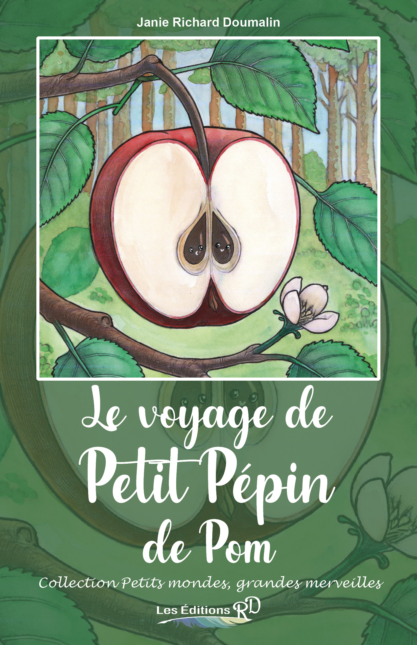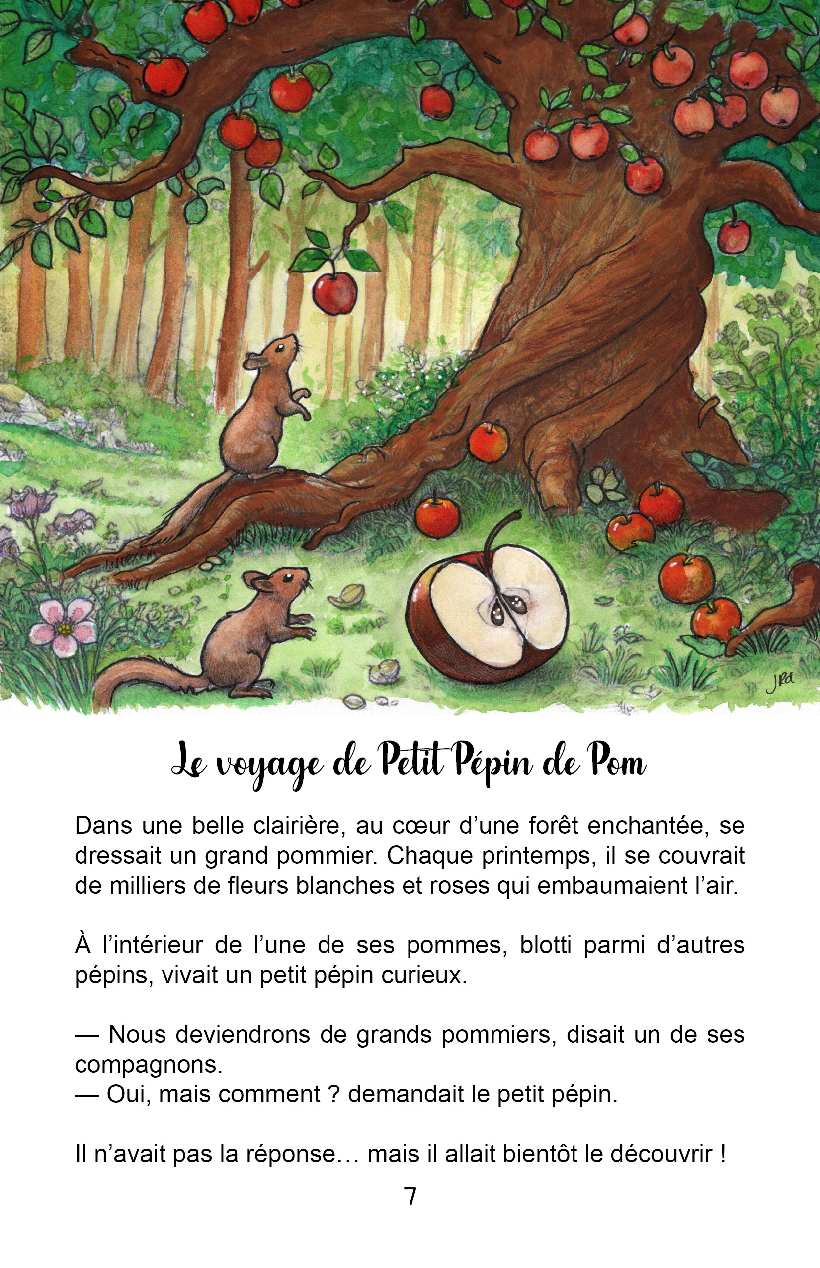Dans une clairière, un petit pépin de pomme débute un incroyable voyage. Emporté par un cerf, puis enfoui sous la terre, il découvre la magie de la germination, grandit en pommier et participe au cycle de la vie grâce aux abeilles et aux animaux. Une histoire tendre et poétique qui fait découvrir aux enfants le cycle naturel des pommes et l’importance de la nature.
