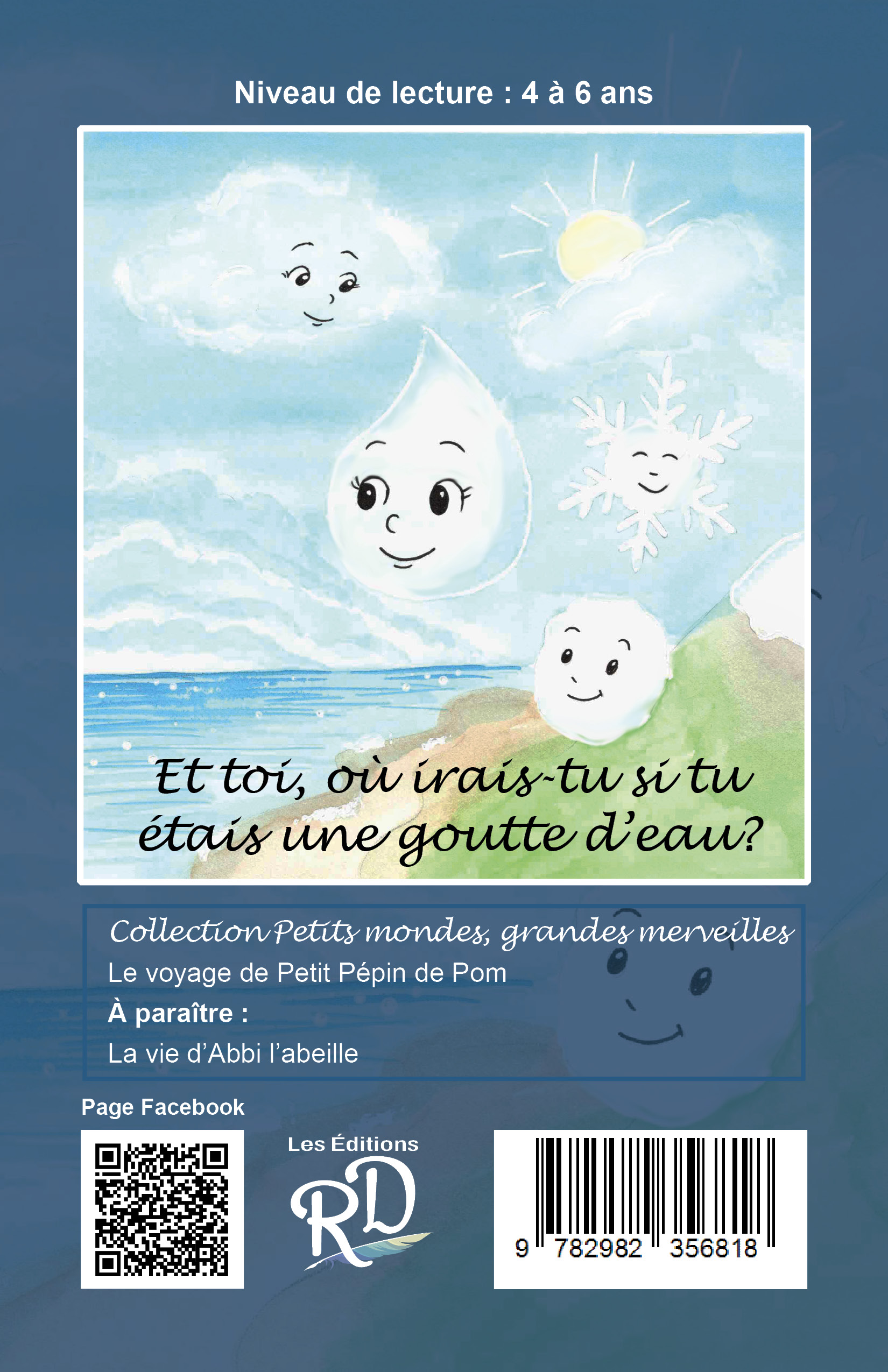 Ophélie est une petite goutte d’eau curieuse qui parcourt le monde et le temps au fil du cycle de l’eau. De l’océan aux nuages, des rivières aux souterrains, en passant par un brontosaure, un orage ou même une limonade, elle vit des aventures étonnantes qui font découvrir aux enfants la magie et l’importance de l’eau. Les jeunes lecteurs découvrent comment l’eau circule entre ciel, terre, animaux et humains.